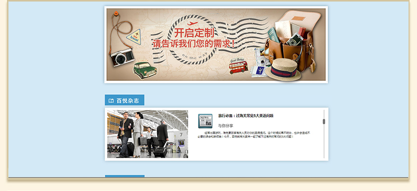Project Description 百悦逸游于2012年初由二位资深的旅行家创办,是成都传媒集团旗下成都新闻国际旅行社有限公司的高端旅游品牌,总部位于成都高新区天府大道中段美年广场。在百悦逸游成立之前,创始团队亲自到全球三十多个国家实地考察,带着第一手的资讯和执着的信念创立了中国西部第一家真正意义上的私人定制旅行机构。百悦的旅行不是跟团挤大巴,不是十天去十个国家,更不是没完没了的... Official website address 宁德http://www.100.travel I want to share